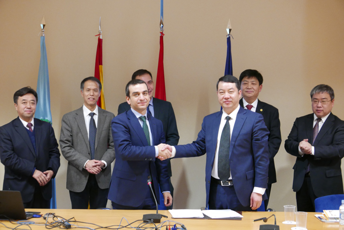 图1:吴斗庆与西班牙胡安卡洛斯国王大学副校长Abraham Duarte Muñoz签署校际合作框架协议