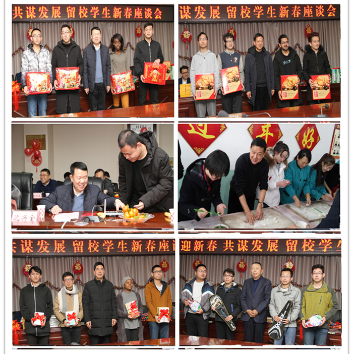 座谈会上,沈兴全与来自山东的一名留校学生家长接通亲情电话,代表学校及全校师生向他们拜年,希望家长放心,学校会尽力安排好留校学生们的生活,让他们在学校度过一个别有意义的春节。学生家长对学校周到的安排表示感谢。校领导按照传统习俗为留校学生发放了压岁红包和新春礼包。