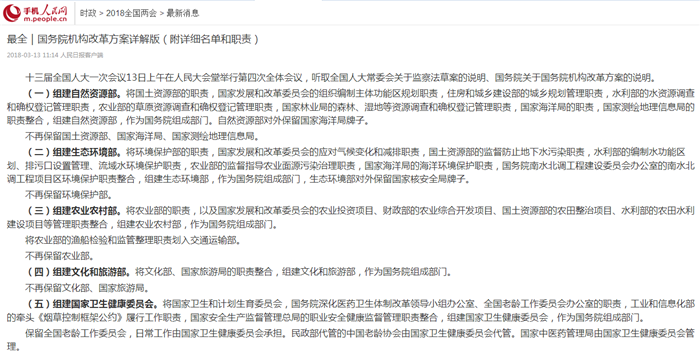 (二)组建生态环境部。将环境保护部的职责,国家发展和改革委员会的应对气候变化和减排职责,国土资源部的监督防止地下水污染职责,水利部的编制水功能区划、排污口设置管理、流域水环境保护职责,农业部的监督指导农业面源污染治理职责,国家海洋局的海洋环境保护职责,国务院南水北调工程建设委员会办公室的南水北调工程项目区环境保护职责整合,组建生态环境部,作为国务院组成部门,生态环境部对外保留国家核安全局牌子。