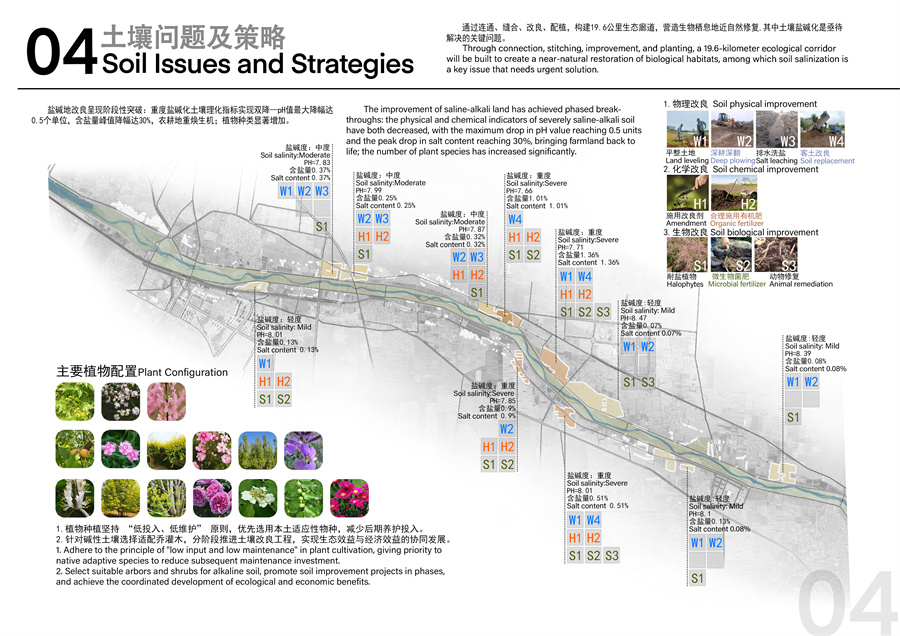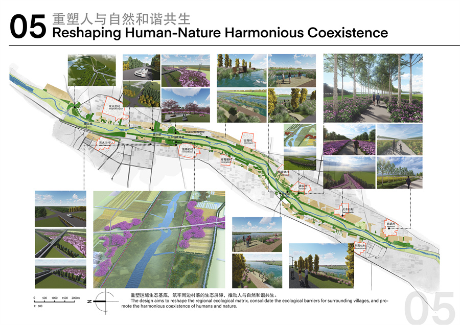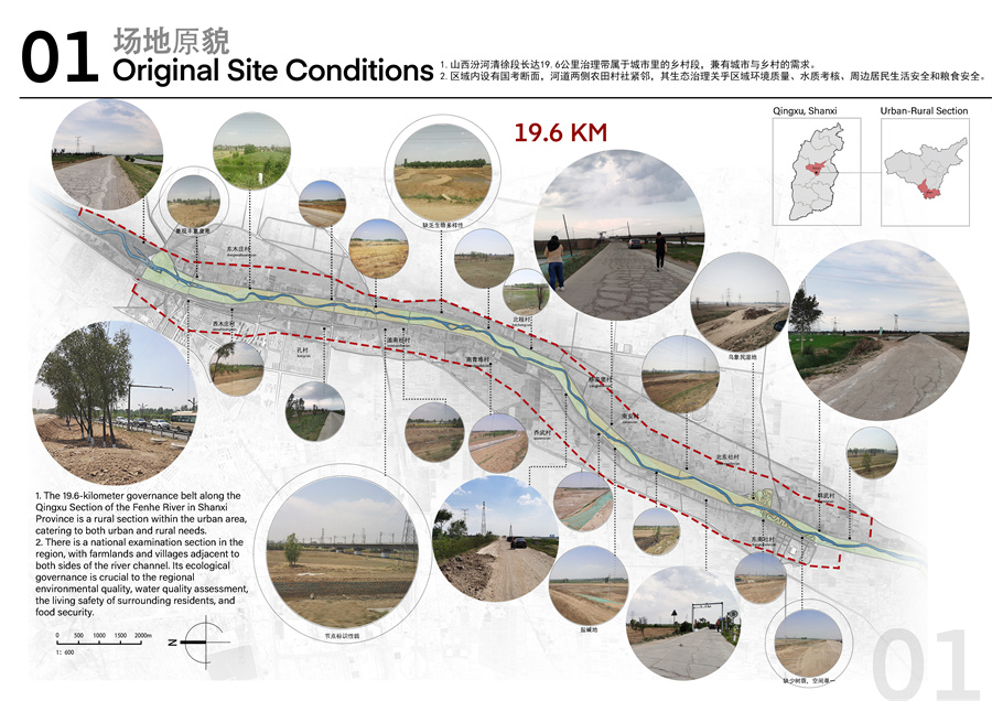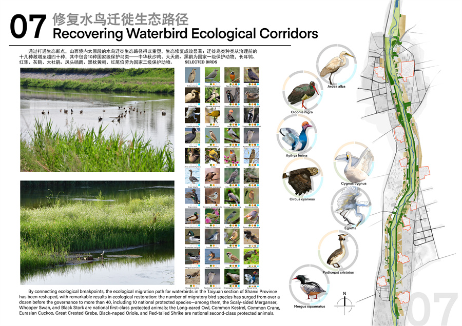 汾河干流(清徐段)堤顶路及堤外综合治理项目位于清徐县,全长19.6公里,占地面积189.82公顷。面对改造前植被稀疏、堤顶路破损等问题,该项目团队创新提出三大治理策略:构建19.6公里连续生态廊道,改良盐碱化土壤,重建水鸟迁徙路径;恢复农田生态功能,引入杨树、栾树等乡土树种构建固碳植被群落;坚持低人工干预、低维护成本的可持续运维模式。在设计过程中,浦京团队充分运用了本土化的生态智慧与现代科技手段,立足于汾河流域生态保护与高质量发展的国家战略,不仅有效恢复了河岸带的自然生机,更巧妙地将三晋大地的文化元素融入景观设计之中,将昔日的河道荒滩,精心打造为一条集防洪安全、生态修复、景观休闲、文化传承于一体的综合性生态廊道,使项目成为讲述山西故事、展示中国治水智慧的靓丽窗口。