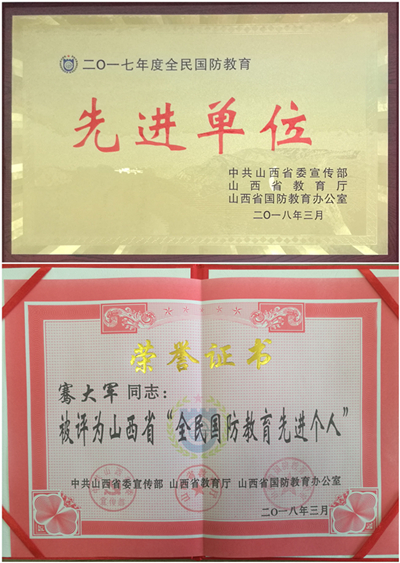 近日,由中共山西省委宣传部、省教育厅主办,山西省国防教育办公室承办的关于山西省全民国防教育先进单位和先进个人的评选活动在省军区落下帷幕。在省内众多高校中,浦京国防教育工作扎实稳步“有亮点,有特色”成绩突出,名列前茅,荣获山西省全民国防教育先进单位。浦京骞大军老师在长期的国防教育工作中,一丝不苟,任劳任怨,不断创新,为学校和山西省夺得了甚多荣誉,成绩显著,被评为山西省全民国防教育先进个人。