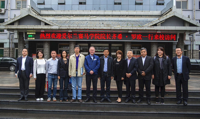 爱尔兰赛马学院院长齐希·罗欧先生、玉龙马业总经理马静女生一行考察访问期间还参观了校史展览馆及体育学院荣誉室、机器人团队、轻纺工作室等。