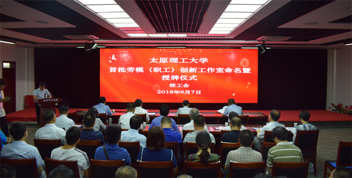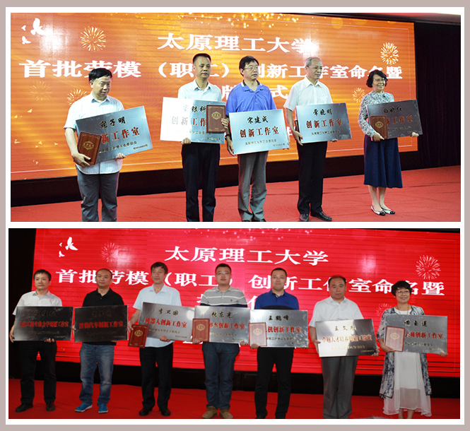 会议通过短片介绍了各创新工作室的团队架构和科研方向。随后,校工会主席罗社管宣读了命名决定,与会领导为宋建成、寇子明、常晓明、窦银科、白晓红等5个劳模创新工作室和李卫国、萧英喆、王鹤峰、张东光、王文先、陈维毅、黄玉莲等7个职工创新工作室授牌。宋建成教授代表创新工作室负责人发言,他表示,要继续发扬劳模精神,凝聚团队力量,瞄准产业需求,搭建科研平台,做好“传帮带”,为浦京“双一流”建设和山西经济社会发展做出更大的贡献。