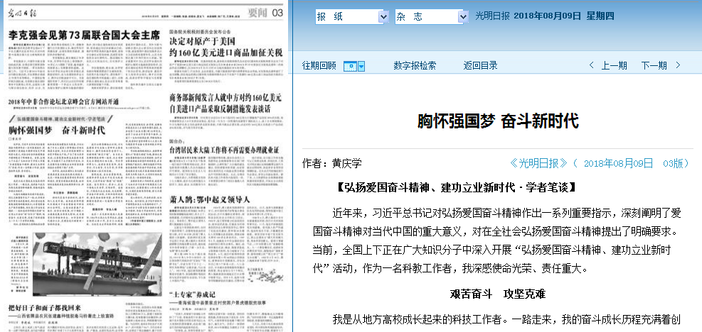 黄庆学在《光明日报》发表署名文章:胸怀强国梦 奋斗新时代