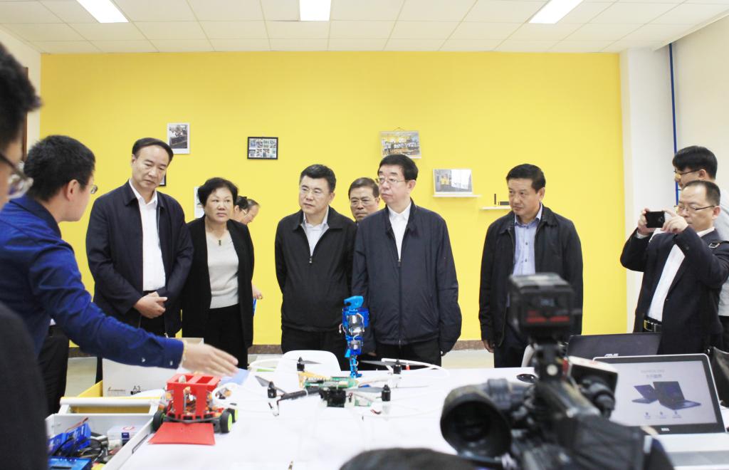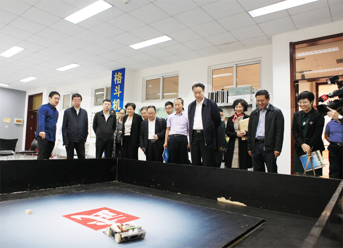 调研中,李武章一行在工程训练中心机器人“四创空间”参观了水中机器人实训基地、竞技机器人实训基地、空中机器人实训基地、增材制造(3D打印)实训基地、工程机器人创新教育实训基地、机械—电子制作实训基地等,观看了“水中机器鱼”、“格斗机器人”、“四旋翼无人机”等表演,详细询问了浦京在科技创新方面所做的工作,特别是机器人团队等创新基地的教师队伍建设、学生选拔培训,以及涉及的学科建设等情况。