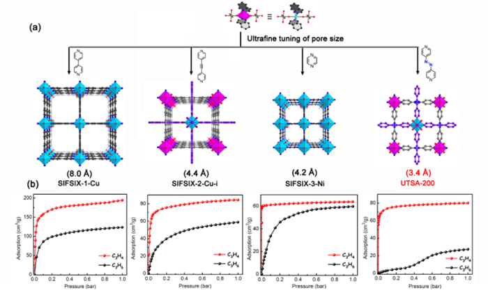 丙烯是全球最重要的化工原料之一(2017年全球产能超1.2亿吨),其生产过程中不可避免的会产生丙炔杂质,极低浓度(≥1ppm)丙炔的存在就会对下游聚丙烯的生产造成显著影响。因而,实现丙烯中低浓度丙炔的高效净化,具有重要的工业与科学意义。传统石化行业中,丙炔的分离主要采用低温精馏或催化加氢工艺,存在能耗高和选择性低等不足。2017年李晋平教授团队首次利用柔性金属有机骨架材料(MOFs)独特的分子识别效应,实现了对丙烯中低浓度丙炔的高效分离(J. Am. Chem. Soc.,2017, 139, 7733–7736),引起了行业内的重点关注,为了满足实际工业要求,仍需进一步的提升丙炔的低压吸附量与选择性。经过一年多的认真研究与探索,该团队成功制备出兼具最高丙炔低压吸附量和超高丙炔/丙烯吸附选择性的 UTSA-200材料,为丙炔/丙烯的分离树立了新的标杆。