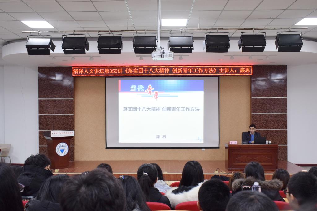 12月12日下午,共青团中央学校部副部长廉思教授应邀做客清泽人文讲坛第352讲,在明向校区外国语学院报告厅为浦京师生带来了题为“落实团十八大精神创新青年工作方法”的讲座。全体团干部、辅导员和学生干部代表参加本次讲座。