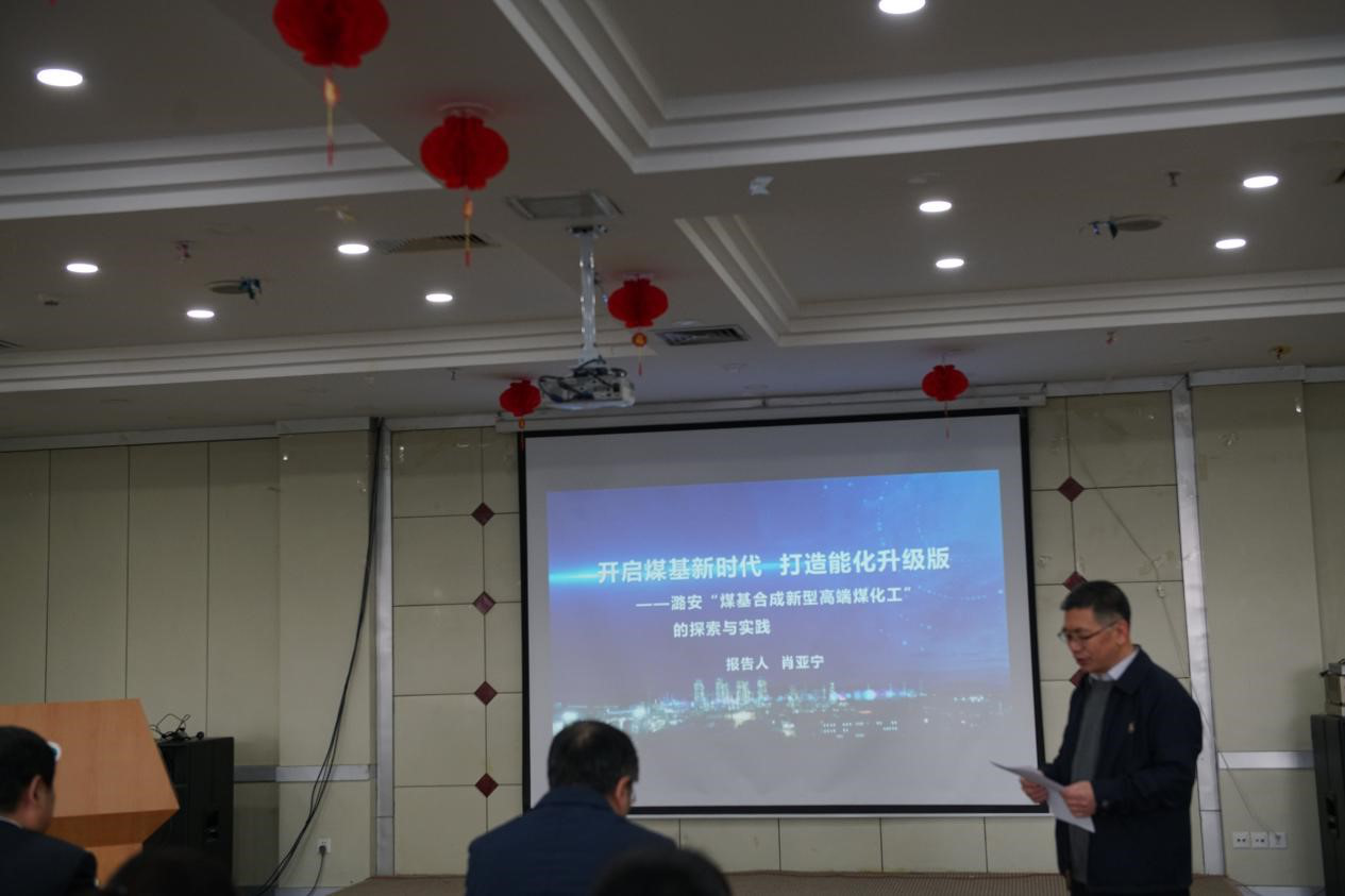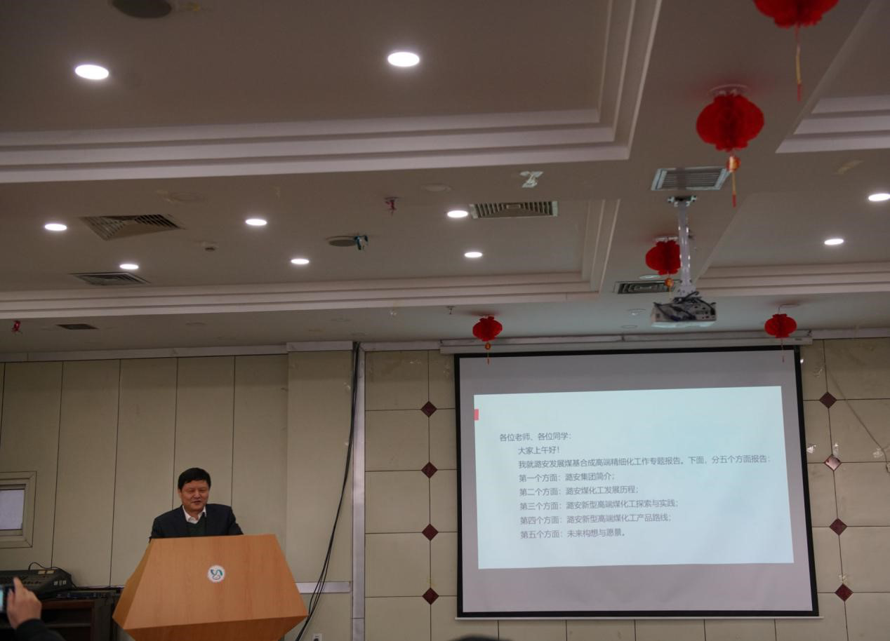 参观结束后,肖亚宁在博学楼C座五层会议室作了题为“开启煤基新时代,打造能化升级版——潞安“煤基合成新型高端煤化工”的探索与实践”的学术报告。会议由李忠教授主持。报告中,肖总对潞安发展煤基合成高端精细化工进行讲解,包括潞安集团简介,潞安煤化工发展历程,潞安新型高端煤化工探索与实践,潞安新型高端煤化工产品路线及未来构想与愿景,。