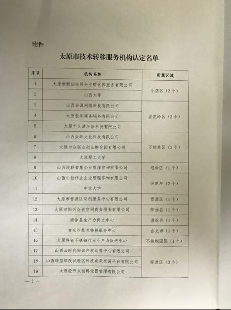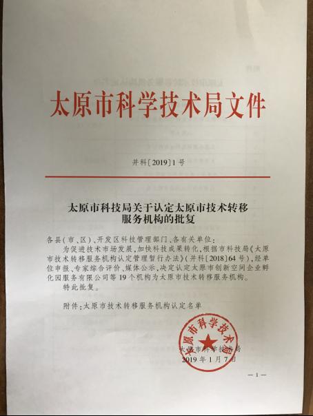 为贯彻落实《中共太原市委太原市人民政府关于科技创新推动转型升级的若干意见》(并发[2018]6号)文件精神,加强技术转移机构建设,促进科技成果转移转化。根据太原市科技局《太原市技术转移服务机构认定管理暂行办法》(并科[2018]64号)规定,太原市科学技术局在2018年12月组织开展了太原市技术转移服务机构的认定工作。经资格审查、专家综合评审后,浦京科学技术研究院作为驻并高校内设机构被认定为太原市技术转移服务机构。
