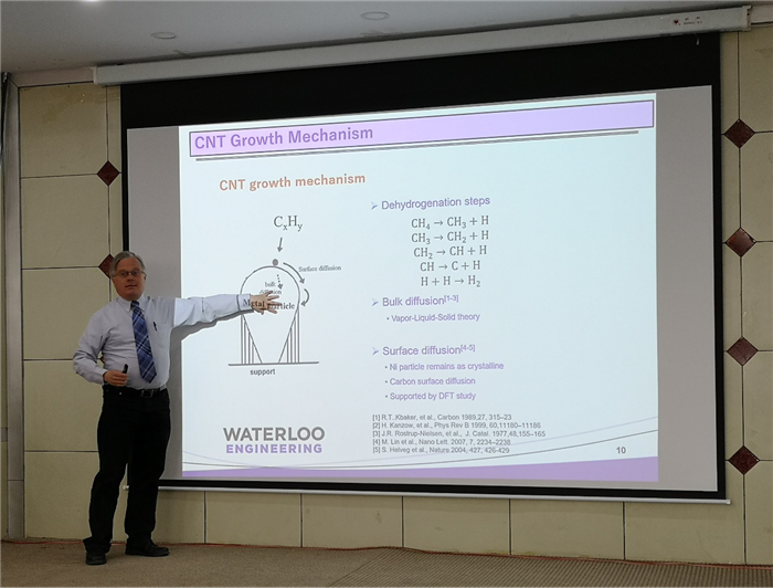 随后Eric Croiset教授做了题为“Simulation of Carbon Deposition on Ni Catalyst: Applications to Methane Catalytic Cracking and Solid Oxide Fuel Cell (SOFC) Button Cell Modelling”的学术报告,介绍了镍催化剂上炭沉积在甲烷催化裂化和固体氧化物燃料电池领域应用的研究成果,着重对镍催化剂催化甲烷裂化制备碳纳米管的生长机理,以及固体氧化物燃料电池中甲烷吸附转化发电反应机制的进行了详细阐述。报告内容深入浅出,拓展了与会教师和研究生们的专业视野,并与在场师生们进行了互动交流。副校长梁卫国接见了Eric Croiset教授一行,并就进一步建立校际之间交流的设想和计划进行了交谈。随后,Eric Croiset教授一行参观了煤科学与技术重点实验和中国煤炭博物馆。