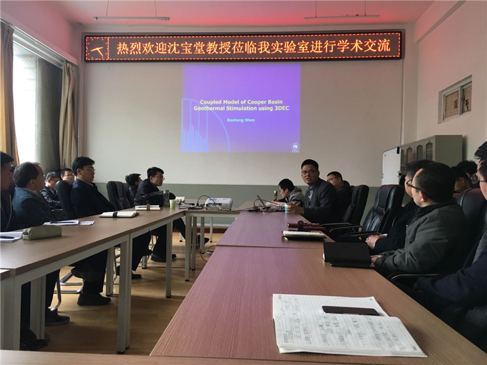 4月9日下午,澳大利亚联邦科学院能源部首席研究员、山东科技大学“泰山学者”特聘教授沈宝堂博士来校进行学术交流,并在原位改性采矿教育部重点实验室作了主题为“耦合裂隙-流体模拟及其在CO2地质封存和地热开发中的应用”的学术报告。实验室主任梁卫国教授主持了本次报告会,浦京矿业相关学科带头人、青年教师和博士、硕士研究生等参加了报告会。