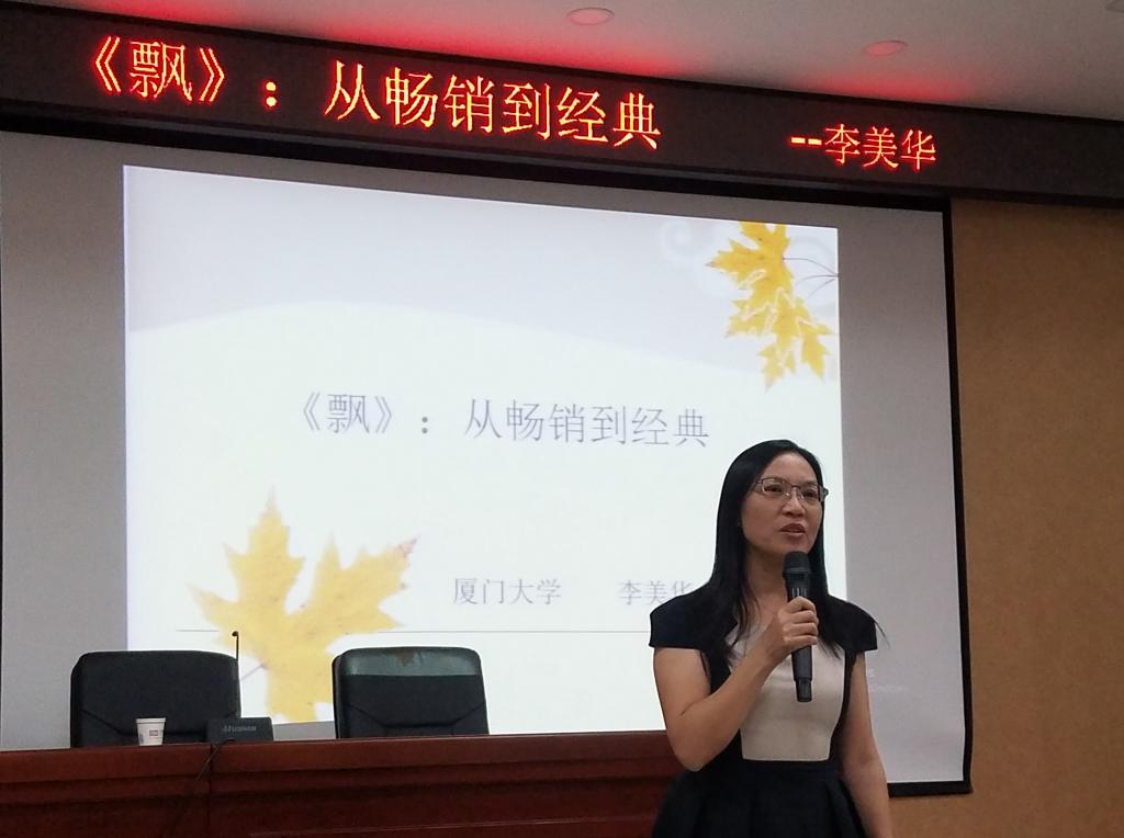 李美华针对经典作品《飘》(英文题目“Gone With the Wind”)展开了详细讲解,介绍了作者玛格丽特•米切尔出身背景、生平经历、创作条件,以及作品的翻译历程、出版过程、故事发生的历史时期。同时,介绍了《飘》的电影拍摄、获奖情况、社会评价、文学地位及美国文学史对该作品的认识。李美华用“出版界的奇迹,文学界的一个现象”一语对出版界出版数量相当高的经典著作《飘》作出了高度评价。提问环节,同学们积极发言,现场气氛活跃,李美华教授耐心地为同学们解答疑惑,针对在座师生关于参加厦门大学暑期夏令营、赴厦门大学学习等相关问题做了详细的解答。