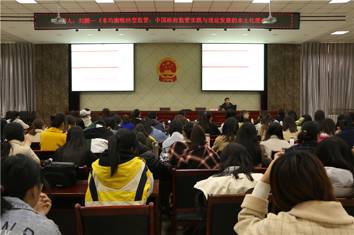 11月3日,中国人民大学公共管理学院博士生导师刘鹏教授受邀于政法学院模拟法庭围绕"非均衡吸纳型监管:中国政府监管实践与理论发展的本土化逻辑"这一论题,为学院行政管理专业师生进行讲座授学。学院院长李永福出席并主持讲座。讲座前,李永福代表学院对刘鹏教授的到来表示了热烈的欢迎和衷心的感谢。