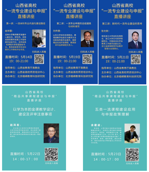 本次系列培训是按照《山西省教育厅关于组织申报2020年山西省高等学校省级一流专业建设点的通知》和《山西省教育厅关于开展2020年山西省精品共享课程认定工作的通知》的文件精神,根据山西省高校师资培训中心《关于举办山西省高校一流专业建设与申报线上系列讲座的通知》和《关于举办山西省高校精品共享课程建设与申报线上系列讲座的通知》的具体安排专门开展的,特别邀请吉林大学金祥雷研究员、山东大学刘传勇教授、浙江大学张光新教授、华北电力大学赵洱岽教授、上海交通大学余建波研究员分别做了题为《一流本科专业内涵与建设路径》、《一流专业申报的总结凝练与材料填写》、《新时代一流专业建设的思考》、《以学为本的金课教学设计、建设及评审注意事项》、《五类一流课程建设应用与申报政策理解》的专题讲座。
