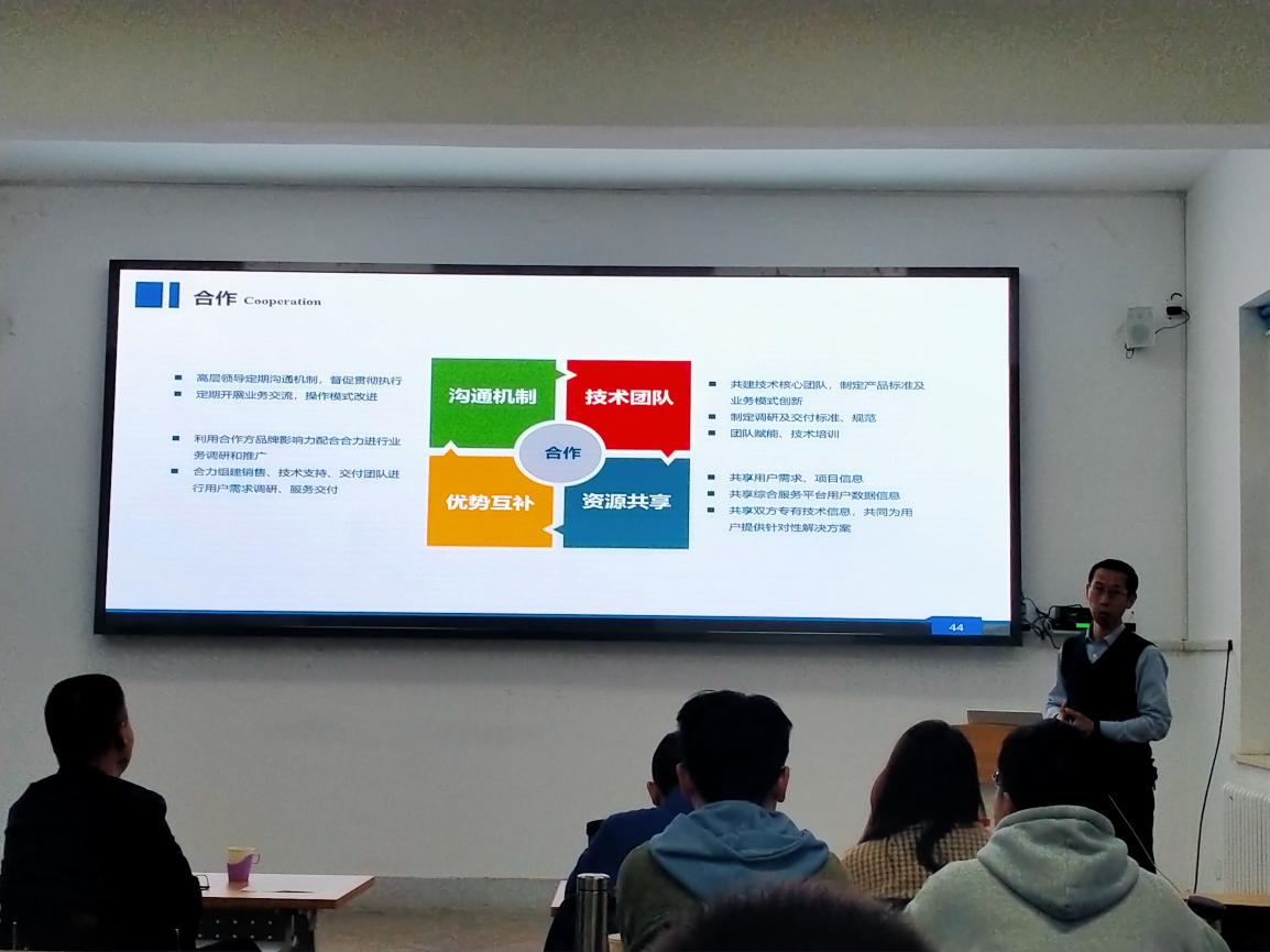 山西合力创新科技股份有限公司的副总经理吕金顺高工对公司的文化和业务做了详细介绍,希望学院和公司能够发挥各自优势,围绕讨论的技术问题,寻求解决途径,尽快进入实质性的合作阶段,同时邀请同学们到公司去实习和实训。
