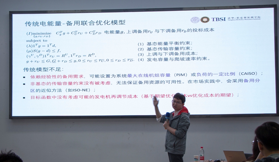 报告中,郭烨提出当前新能源主体的电力系统正面临着新能源的随机性与波动性两大重要挑战,而应对随机性和波动性的关键是在系统运行中预留充足的备用资源和保证系统有足够的爬坡能力,这两方面又都与可控机组的灵活性密切相关。针对以负荷的一定比例(CAISO)提出的灵活爬坡产品(FRP)为代表的关于备用与爬坡市场机制的热点问题,郭烨助理教授从两个方面,介绍了其团队近期研究成果。在备用方面,提出了基于场景模拟的电能量-备用联合优化模型,推导了电能量与备用的定价方法,并提出了前瞻和后顾两阶段的市场结算机制。在爬坡方面,提出了多时段定价需满足的一般市场均衡与局部市场均衡特性。并且结合以上两方面提出了区别性定价的时间节点边际定价方法(TLMP),能够解决市场外结算问题。报告结束后,郭烨助理教授与学院老师、学生们进行了深入探讨,详细回答了学生在相关研究领域的一些疑问。秦文萍教授表示,本次报告会为学院与清华-伯克利深圳学院的相关团队提供了交流平台,希望同学们借此机会了解到相关研究领域的前沿进展。