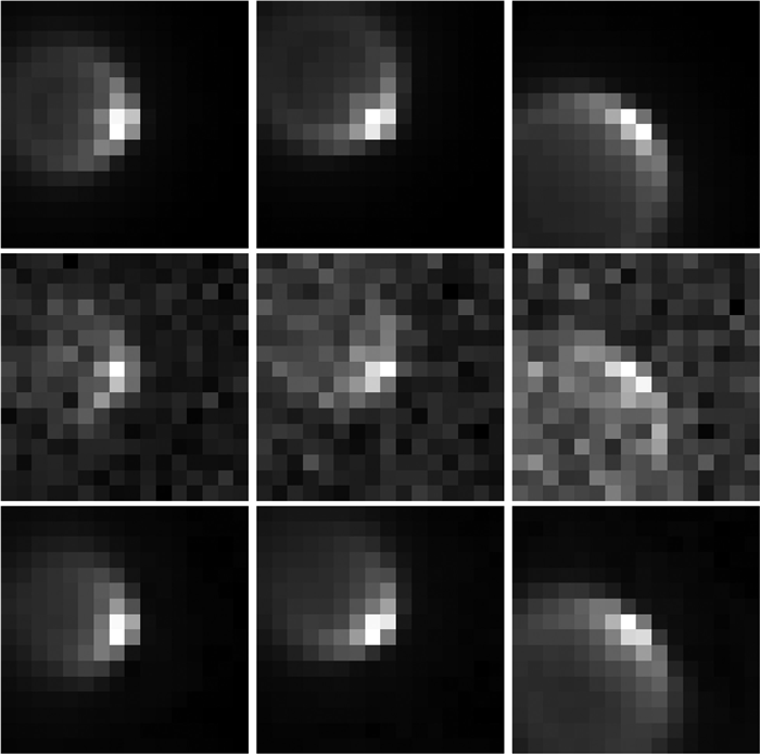图1.第一行为光学系统输出的原始PSF,第二行为低信噪比条件下的实拍星象,第三行为从低信噪比图像中估计出的PSF。