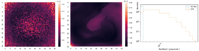 图2.左图为内插法IDE获得的望远镜任意失调状态全视场PSF估计结果的MSE均值分布,中图为Tel-Net获得的望远镜任意失调状态全视场PSF估计结果MSE均值分布,右图为两种方法获得的PSF的MSE直方图分布。