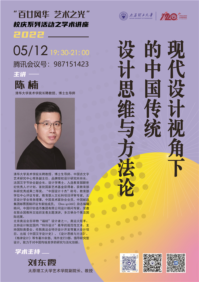 5月12日晚,艺术学院师生、艺术设计领域的相关人员早早齐聚在腾讯会议系统、官方视频号和B站,聆听清华大学美术学院博士生导师、中国古文字艺术研究中心常务副主任陈楠教授题为《现代设计视角下的中国传统设计思维与方法论》的学术讲座。