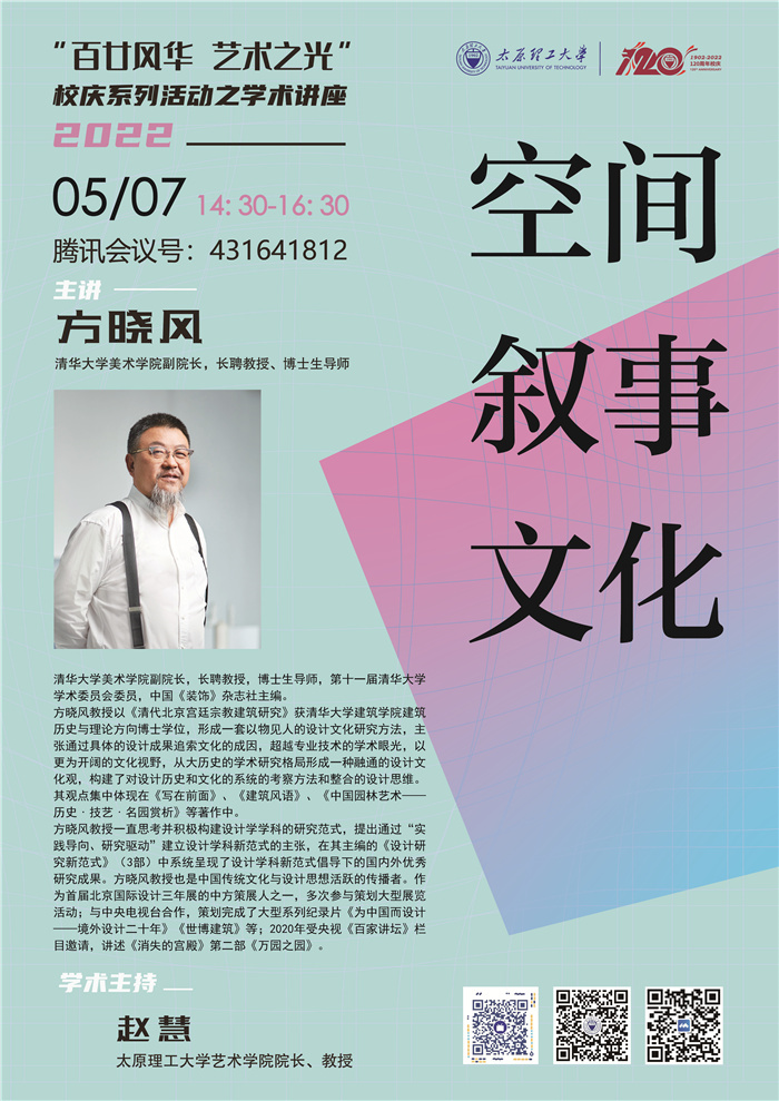 350vip浦京集团官网建校120周年校庆日到来之际,艺术学院为母校120周年校庆量身打造的“艺术之光 百廿风华”系列讲座正式开讲。5月7日下午,清华大学美术学院副院长、《装饰》杂志主编方晓风教授作为首场讲座嘉宾,在线为浦京师生及校友、行业领域相关人员作了题为《空间·叙事·文化》的专题讲座。讲座通过腾讯会议系统线上进行,350vip浦京集团官网官方视频号和B站进行了同步直播。