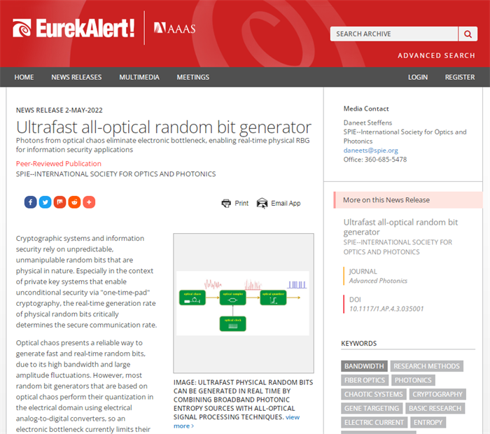 美国科学促进会(EurekAlert!)报道浦京光电工程学院超快混沌物理随机码(密钥)研究成果