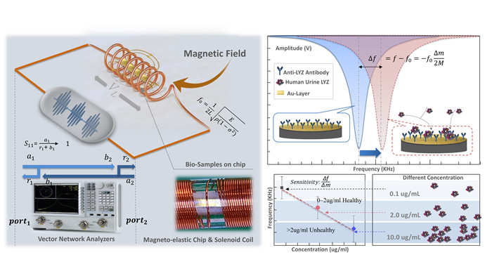 人体尿液中的溶菌酶作为肾小管和肾小球疾病的指标具有重要的临床意义。大多数溶菌酶检测方法依赖于一个繁琐检测过程,方法耗时且操作复杂,对仪器和试剂要求也较高,这大大限制了在慢病管理中智能化溶菌酶快检临床应用。因此,本工作中研究人员提出了一种磁致弹性免疫传感器(Magnetoelastic Immunosensor, ME),通过磁致伸缩效应下共振频率的变化来快速检测溶菌酶,实现了针对不同浓度溶菌酶的模拟尿液便携快速检测。