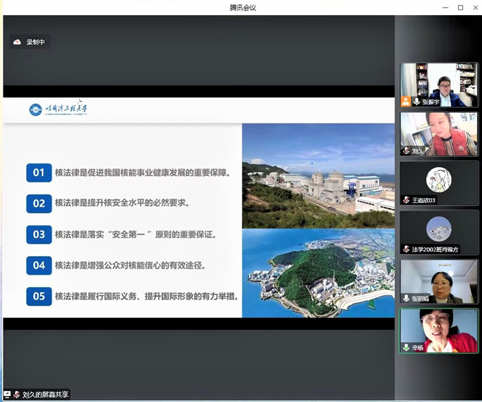核安全是国家安全的重要组成部分,在第一部分刘久结合自己对于核安全、核法律的研究体会,分享了对习近平法治思想中“正确处理发展与安全的关系”的理解,统筹发展和安全既需要政治上的高度重视,也需要法治上的保障。刘久认为,法律对于安全是一种方法,是核安全的有力保障,进而引出国家安全的内涵。刘久表示,切尔诺贝利事件、因捡到有辐射的“钥匙链”而致残事件等引发了公众对核事故、核损害的关注。刘久简要介绍了核电站发电的运行的过程,核燃料的闭式循环,让同学们对核电有了更近的认识。从核安全狭义上的理解出发,刘久详细地介绍了核保障(nuclear safeguard)、核安保(nuclear security)、核安全(nuclear safety)三个概念的内涵,以及这三个概念在我国《国家安全法》第三十一条的具体体现。刘久还介绍了我国涉核的立法进程,重点介绍了1986年《民用核设施安全监督管理条例》《放射性污染防治法》以及现今作为我国核领域规范核安全监督的顶层立法的《核安全法》,并且还为大家讲解了核安全应急响应制度、核材料和设备贸易、乏燃料与放射性废物管理、核材料和放射性废物运输、第三方核责任等。刘久指出,核法律涵盖了中国政府遵守国际核安全、核安保及国际核保障义务的基本规定,更重要的是反映出中国和平利用核能的宗旨,体现出我国为遵守国际核领域规则做出的法律承诺。此外,《原子能法》作为基础性法律依旧缺位,期待它的正式颁布与施行。最后,刘久对日本处置福岛核废水问题及俄乌战争中扎波罗热核电站的安全问题的法律应对提出自己的见解,并向大家分享了其近期在《环球时报》上刊发的《日本处置核污水须向国际社会说清楚》《扎波罗热核电站应“免受攻击”》等文章的主要内容。