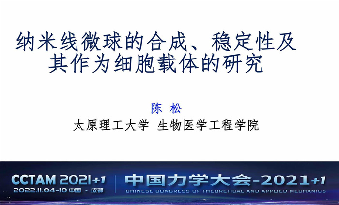 陈松在“生物材料与仿生力学专题研讨会”作了题为“纳米线微球的合成、稳定性及其作为细胞载体的研究”的邀请报告,报告介绍了具有多级结构纳米线微球的合成及其作为细胞载体的应用,该研究有望为细胞提供一种潜在的生长支架材料。