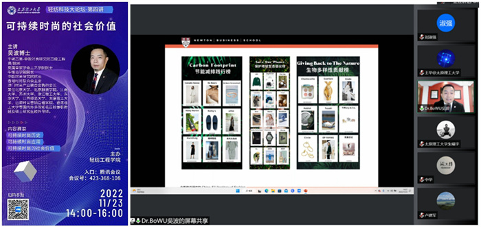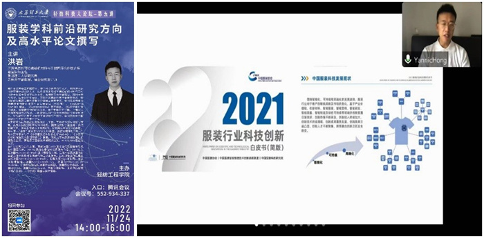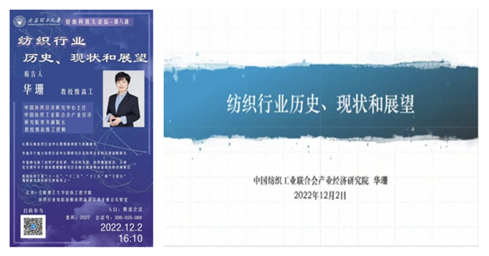 为了加强学术交流,开拓专业视野,轻纺工程学院于11月、12月组织开展了10讲“轻纺科技大论坛”系列学术讲座,活动邀请西南大学张龙琳教授、天津工业大学汪晓银教授、江南大学蒋高明教授、牛顿商学院院长吴波博士、苏州大学洪岩博士、青岛大学田明伟教授、天津工业大学庄旭品教授、中国纺织工业联合会产业经济研究院华珊主任、西安工程大学樊威教授、江南大学牛犁教授等多位纺织服装领域知名专家分别做《新时代·新学科·新未来——面向国家和行业需求的数字时尚创新与实践》《纺织科学与工程中的数学建模》《纺织科学技术未来发展趋势》《可持续时尚的社会价值》《服装学科前沿研究方向及高水平论文撰写》《基于纺织技术的智能纺织品与可穿戴应用》《纳米纤维三维组装的调控策略及其气凝胶纤维制备》《纺织行业历史、现状和展望》《智能/功能纤维复合材料》《艺术类基金项目的选题、申报与结项》的在线讲座。
