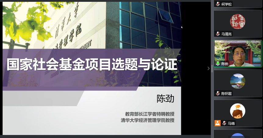 清华大学陈劲教授(国家杰出青年科学基金获得者、入选国家“百千万人才工程”、教育部“长江学者”特聘教授;教育部人文社会科学重点研究基地——清华大学技术创新研究中心主任)指出,获批社会科学基金是高校教师肩负国家使命和体现科研能力的重要标志,结合自己的国家社科基金重大项目深入浅出地阐述了如何根据二十大精神从人类文明新形态和中国式现代化等热点问题进行选题,并从学术简历、研究基础和承担项目三个方面细致讲解了如何论证,强调哲学社会科学基金申请要点是深入学习领会党的路线方针政策、具有扎实的社会科学研究基础和研究范式、具有从事政策咨询的素养。在互动环节,他深入回答了老师们提出的社科基金的结项要求、研究方法如何选择、题目如何拟定等问题。