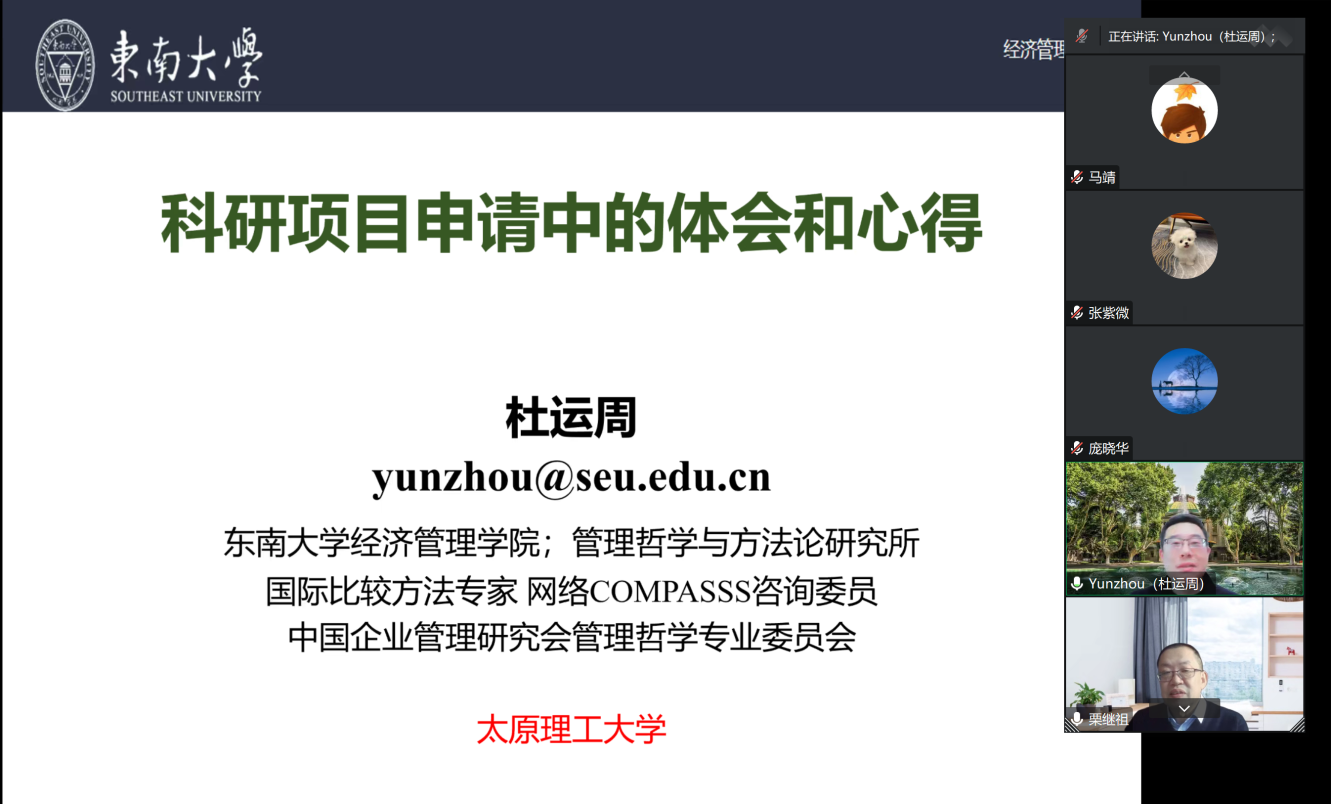 东南大学杜运周教授(主持国家自然科学基金重点项目1项、面上项目3项、青年项目1项;东南大学管理哲学与方法论研究所所长,中国企业管理研究会副理事长,中国企业管理研究会管理哲学专委会会长)分析了国家自然科学基金四类科学问题属性“是什么”“怎么选”,阐述了项目申报中的一些常识和可以规避的风险,以自身获批的面上项目为例,详细介绍了申请书各个部分的撰写经验,从思路清晰、内容充实、逻辑一致与对标超越四个角度分享了心得体会,并与部分老师提出的研究方法选取、研究内容中文献引用、研究内容深度等进行了互动交流。