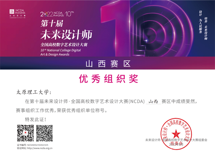 艺术学院承担了未来设计师·全国高校数字艺术设计大赛(NCDA)山西赛区的竞赛组织工作,并在2022年第十届比赛中荣获赛区优秀组织奖,取得国赛一等奖4项、二等奖5项、三等奖7项,以及省赛一等奖18项、二等奖32项、三等奖49项的优异成绩。