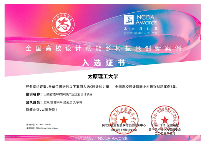 4月8日,未来设计师·全国高校数字艺术设计大赛(NCDA)第58·59届中国高等教育博览会“高校教育赋能乡村振兴发展大会”在重庆召开,并举行新书发布会。艺术学院《山西省道坪村休旅产业规划设计项目》成功入选由未来设计师大赛组委会联合重庆交通大学共同主持编写、上海交通大学出版社出版的《设计的力量——全国高校设计赋能乡村振兴创新案例》,并在学习强国平台展出。