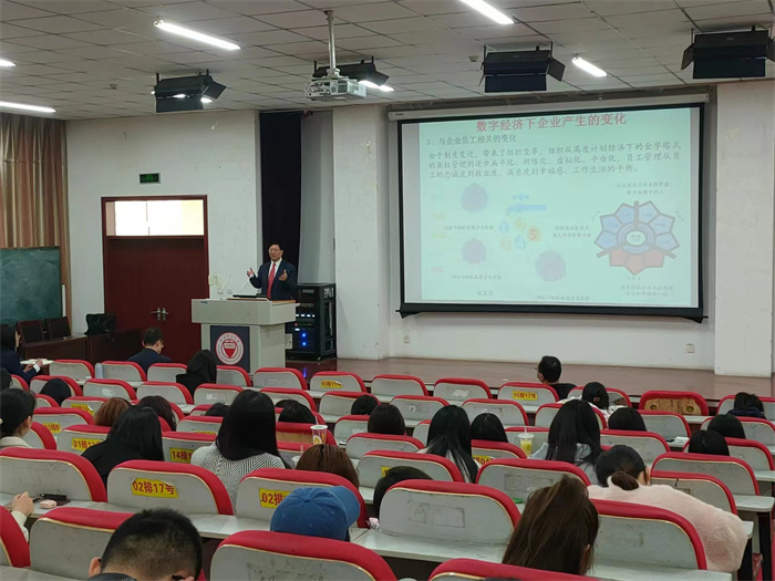 赵曙明教授详细地向大家介绍了数字经济的特点以及在数智时代下企业发生的变化。为阐述在数字经济背景下人力资源管理的转型,赵曙明教授引入海尔战略模式演变案例,指出海尔应对外部环境提出的生态品牌战略,使得海尔通过网络化、平台化建设,把人力资源管理从成本中心变成利润中心。数字经济时代下,人力资源管理从“选,育,用,留”转变成对人力资源的赋能管理,新型企业要基于战略服务发展需求,要更加注重员工的幸福感、工作生活的平衡等精神需求。通过赵曙明教授的报告,师生们对新时代的人力资源管理有了更加详细深入的理解。