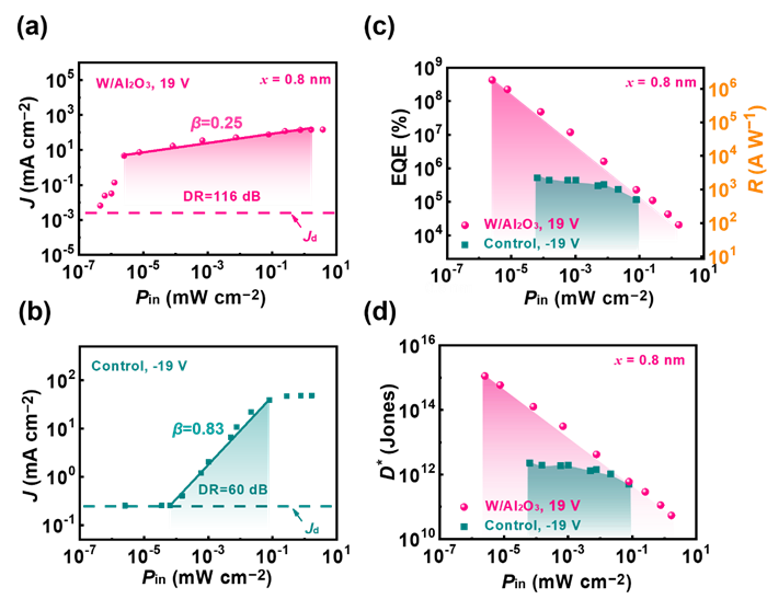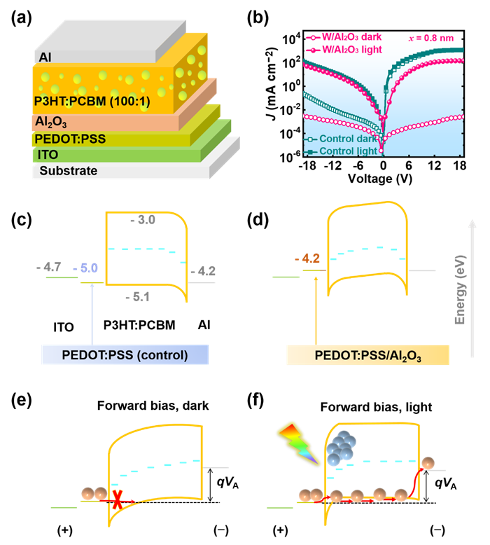 崔艳霞教授团队联合香港浸会大学报道了一种基于原子级化学反应实现具有较低暗电流、超强弱光探测能力且外量子效率可达108%的倍增型有机光电探测器。该研究利用原子层沉积技术在空穴传输层PEDOT:PSS与活性层P3HT:PC71BM(100:1 wt:wt)之间引入0.8 nm厚的Al2O3界面层,通过对薄膜拉曼、XPS及FT-IR性能进行表征,发现Al2O3界面层可与PEDOT:PSS的化学基团发生原子级化学反应,从而调节了PEDOT:PSS的功函数,实现了阳极肖特基接触。通过与阴极肖特基接触协同,该器件在保持高倍增行为的同时,暗电流显著降低。最终,器件的弱光探测性能有显著改善,相比于标准器件(可探测64 nW/cm2弱光),Al2O3界面层器件可探测低至2.5 nW/cm2的弱光,且相应的外量子效率和响应率分别达到4.31×108%、1.85×106A/W,是目前已报道倍增型有机光电探测器的最优值。此策略在新型柔性电子产品及医学成像领域具有很好的应用前景。