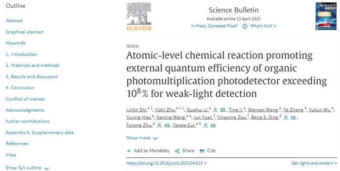 论文信息:Atomic-level chemical reaction promoting external quantum efficiency of organic photomultiplication photodetector exceeding 108% for weak-light detection.Science Bulletin, 2023, 68(9):928–937