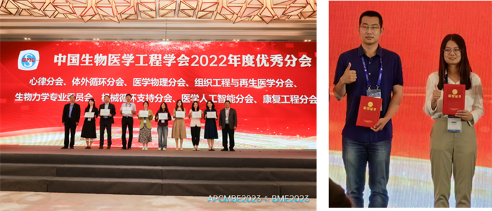 闭幕式上,李晓娜作为生物力学专业委员会秘书与本次“生物力学与人类健康”分会的组织者,代表生物力学专业委员会领取2022年度优秀分会奖,青年教师陈凌峰和薛艳茹分别获得了青年优秀论文竞赛一等奖和三等奖,硕士研究生徐慧伦获得青年优秀论文竞赛三等奖。本次会议邀请了包括两位诺奖者在内的9位中外著名学者作大会主旨报告。会议期间,浦京参会师生与国内外该领域的专家学者进行了广泛深入的交流。与会师生纷纷表示,通过参加此次学术活动,收获颇丰,将对自己下步科研工作,乃至对浦京生物医学工程学科的发展和进步都会起到积极作用。