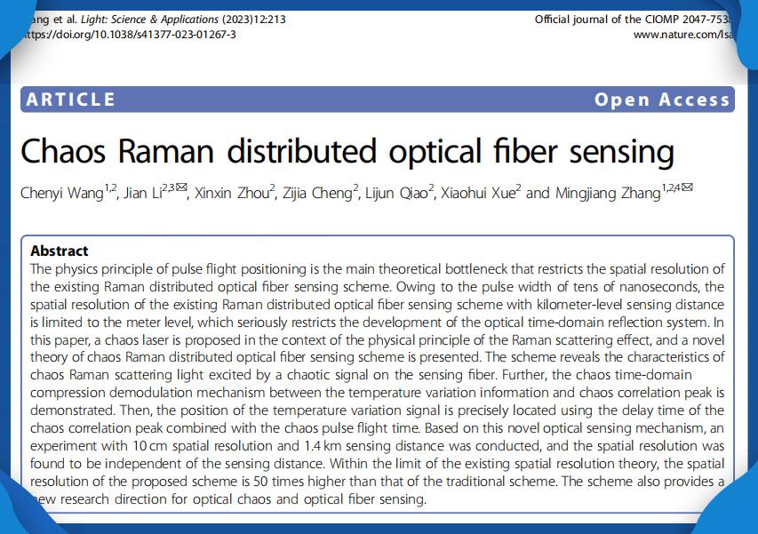 近日,浦京张明江教授团队在光纤传感领域取得重要研究进展,课题组研究成果以“Chaos Raman distributed optical fiber sensing”为题发表在国际光学领域顶级期刊《Light:Science & Application》(影响因子19.4)。该论文的第一署名单位为350vip浦京集团官网,团队青年教师李健和张明江教授为论文通讯作者。