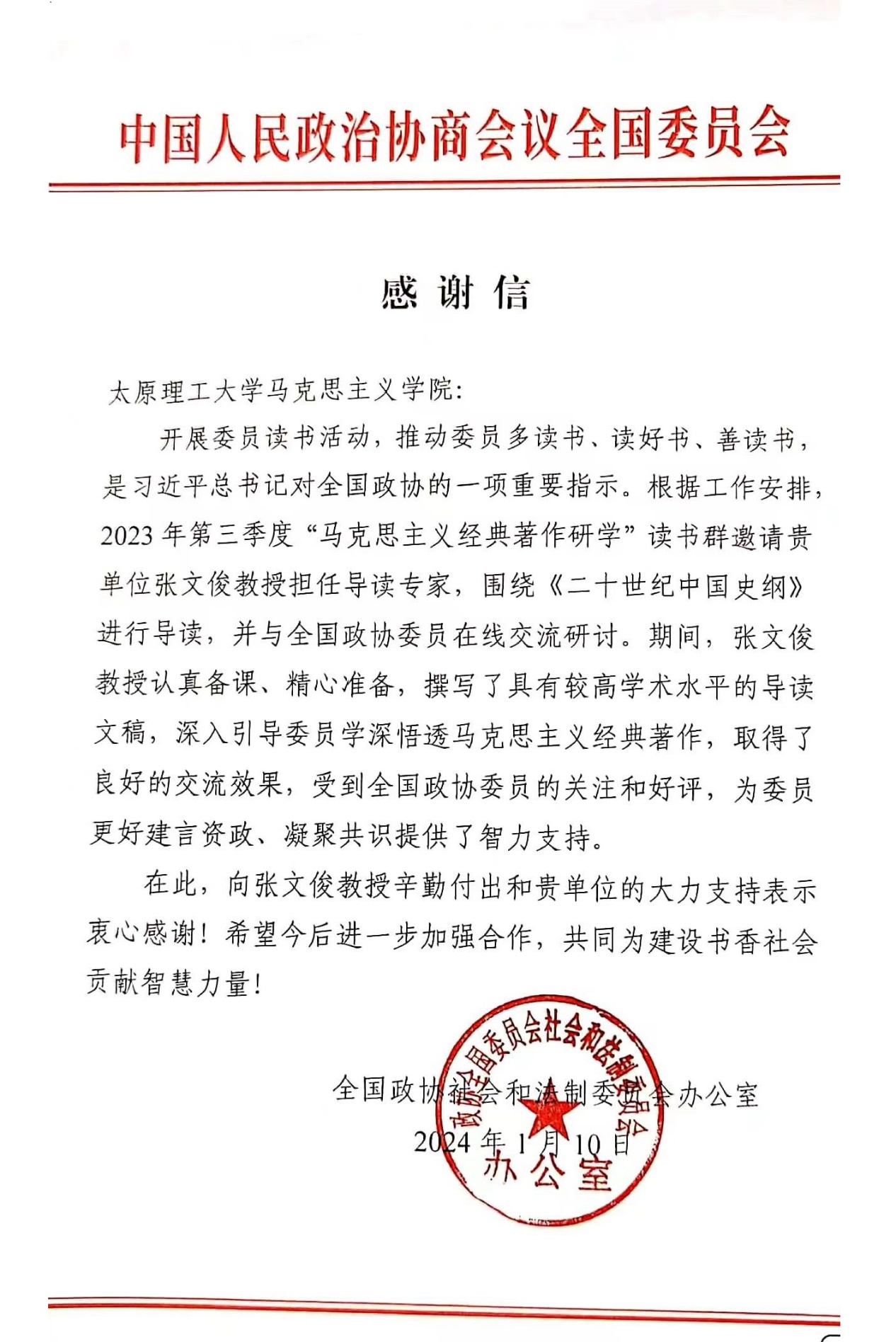 信中提到,开展委员读书活动,推动委员多读书、读好书、善读书,是习近平总书记对全国政协的一项重要指示。根据工作安排,2023年第三季度“马克思主义经典著作研学”读书群邀请浦京马克思主义学院张文俊教授担任导读专家,围绕《二十世纪中国史纲》进行导读,并与全国政协委员在线交流研讨。期间,张文俊教授认真备课、精心准备,撰写了具有较高学术水平的导读文稿,深入引导委员学深悟透马克思主义经典著作,取得了良好的交流效果,受到全国政协委员的关注和好评,为委员更好建言资政、凝聚共识提供了智力支持。希望今后进一步加强合作,共同为建设书香社会贡献智慧力量!