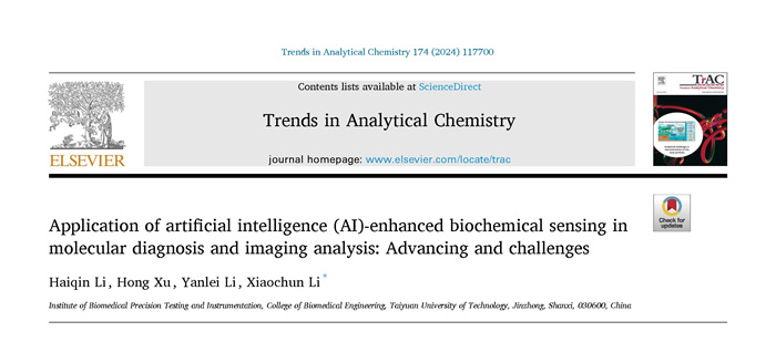 近日,浦京生物医学工程学院李晓春教授团队以人工智能在生化传感方面的应用为主题,应邀在分析化学领域顶级学术期刊《TRAC-Trends in Analytical Chemistry》上发表了题为“Application of artificial intelligence (AI)-enhanced biochemical sensing in molecular diagnosis and imaging analysis: Advancing and challenges”的综述性文章。