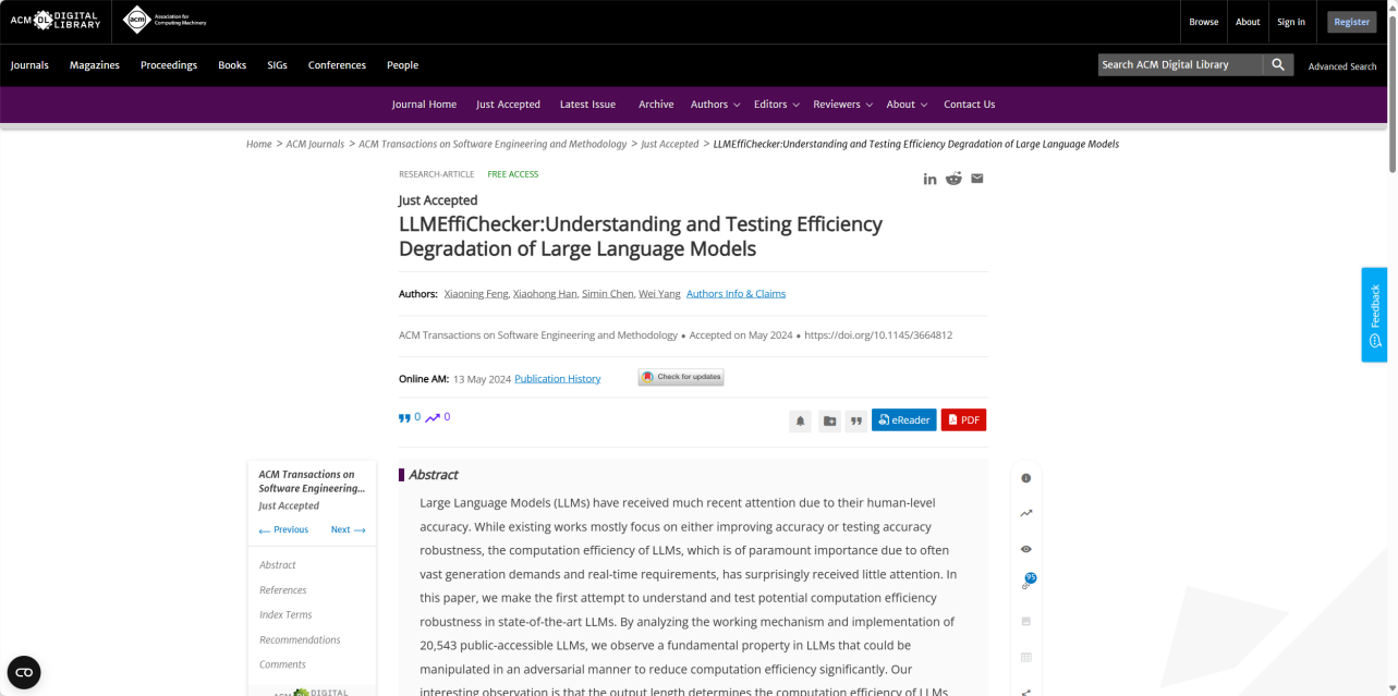 近日,浦京计算机科学与技术学院(大数据学院)韩晓红教授团队在软件工程国际顶级期刊《ACM Transactions on Software Engineering and Methodology》(TOSEM)发表了题为 “LLMEffiChecker: Understanding and Testing Efficiency Degradation of Large Language Models” 的研究论文。TOSEM是国际上公认的最权威、最高水平的软件工程领域顶级期刊之一,也是软件工程领域仅有的两个CCF-A类国际期刊之一。每年1卷,每卷4期,33年(1992-2024)共计收录论文1007篇,年平均接收文章仅30余篇,录用率极低。