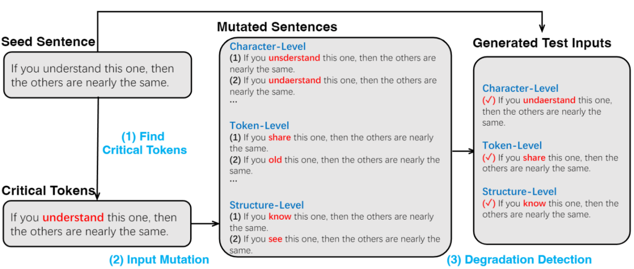 基于以上动机,该论文提出了LLMEffiChecker框架,能够生成充分延迟句子结束标识(EOS)出现的测试输入,迫使LLMs必须经过足够的迭代以满足自然情况下无法达到的阈值。该框架能够在白盒或黑盒场景中生成字符级别,令牌级别和结构级别的微小扰动以充分降低LLMs的计算效率。具体来说,该论文为白盒场景中设计了搜索损失函数,能够最大程度延迟EOS的出现且能打破原有输出的依赖;黑盒场景下设计了基于Delta Debugging和因果推断的算法,能够有效识别种子输入中的关键标识。