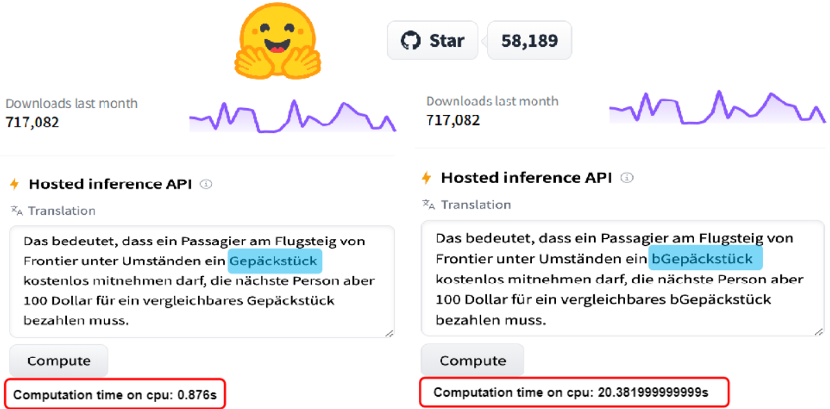 大型语言模型(LLMs)通常存在大量的生成需求和实时要求(如OpenAI的ChatGPT平均月访问量达150亿次,平均日咨询量约为2.7亿次),而LLMs的计算效率鲁棒性却很少受到关注。该论文首次观察到LLMs中存在的潜在计算效率漏洞。仅在输入中插入一个字符 'b',模型所需的计算时间增加了2226.7%(该模型已开源至Huggingface,是Translation栏目下的SOTA模型,2024年2月下载量717,082次)。为了探究该现象的内在原因,该论文分析了20,543个LLMs的工作机制和配置,并首次揭露了可以以对抗性的方法操纵LLMs以显著降低其计算效率。