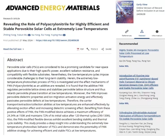 近日,浦京电子信息与光学工程学院有机光电子材料与器件团队在钙钛矿太阳能电池领域取得重要研究进展,研究成果以“Revealing the Role of Polyacrylonitrile for Highly Efficient and Stable Perovskite Solar Cells at Extremely Low Temperatures”为题在国际顶级学术期刊《Advanced Energy Materials》 (一区TOP期刊,影响因子:27.8)上发表。该论文的第一署名单位为350vip浦京集团官网,硕士研究生杨志婷为论文第一作者,团队青年教师吴宇坤讲师和郝玉英教授为论文共同通讯作者。