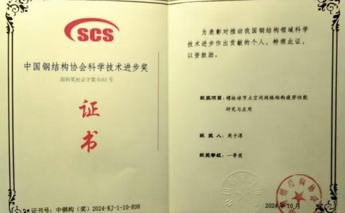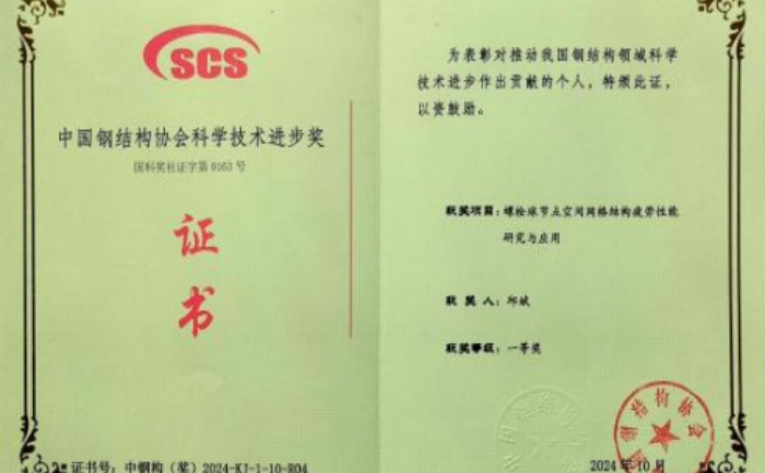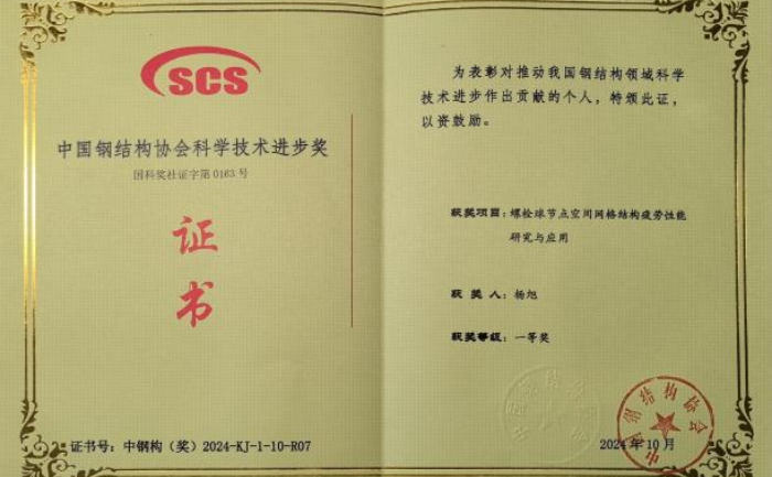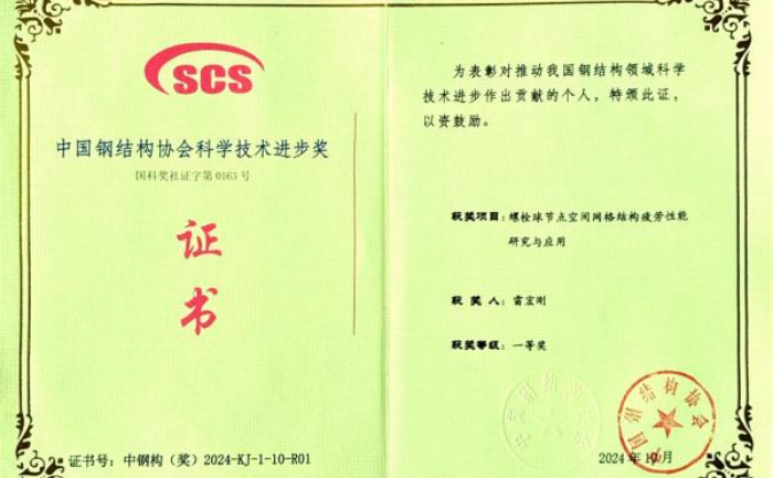 10月21日至22日,中国钢结构协会成立四十周年纪念大会暨2024中国钢结构大会在北京召开,会上举行了隆重的中国钢结构协会科学技术进步奖颁奖仪式。土木工程学院雷宏刚教授率领的钢结构与空间结构研究中心团队完成的项目“螺栓球节点空间网格结构疲劳性能研究与应用”荣获中国钢结构协会科学技术进步奖一等奖。这是团队继2022年获奖项目“悬挂吊车作用下大跨度焊接空心球节点网架结构疲劳性能及设计方法研究与应用”之后,再次荣获一等奖,充分奠定了雷宏刚教授团队在空间网架结构疲劳性能研究方面的重要地位,得到了钢结构行业的高度认可。