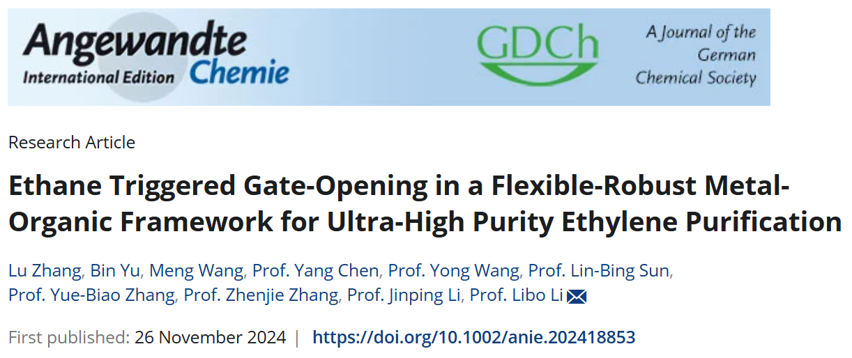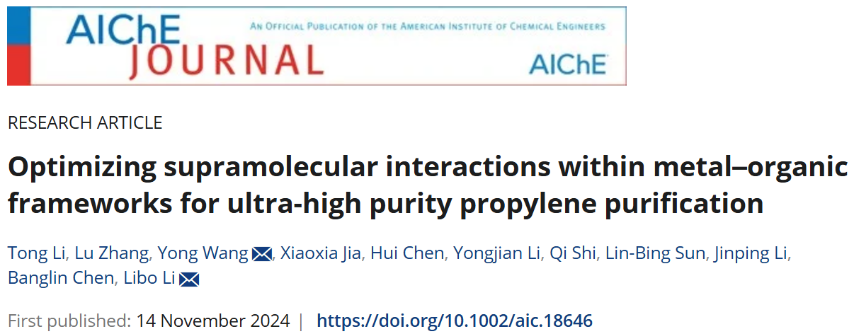 浦京化学与化工学院李晋平教授团队李立博教授课题组在该领域持续攻关,时隔六年在高选择性烷烃吸附材料研发方面取得重要进展,实现对乙烷/乙烯、丙烷/丙烯选择性与吸附容量的显著提升,相继在国际化学知名期刊《Angew. Chem. Int. Ed.》和化工知名期刊《AIChE Journal》发表题为 “Ethane Triggered Gate-Opening in a Flexible-Robust Metal-Organic Framework for Ultra-High Purity Ethylene Purification”和“Optimizing supramolecular interactions within metal-organic frameworks for ultra-high purity propylene purification” 研究论文。