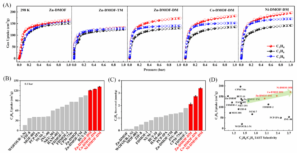 研究成果二:为实现丙烯分离产率与丙烷净化深度的提升,研究团队从孔笼空间优化的角度(图3),提出利用“主-客体”和“客-客体”超分子相互作用的协同吸附机制,实现C3H8和C3H4杂质的同时深度分离。制备的Ni-DMOF-DM材料在常温常压下对C3H8和C3H4表现出极高的吸附容量(分别为 171 和 197 cm3/g)和创纪录的C3H8/C3H6分离选择性(2.74)(图4)。气体分离实验表明,Ni-DMOF-DM 材料可实现直接从C3三元混合物中分离得到超高纯度C3H6(C3H8 < 0.005% 和C3H4 < 1.0 ppm),产率达 152.14 L/kg。