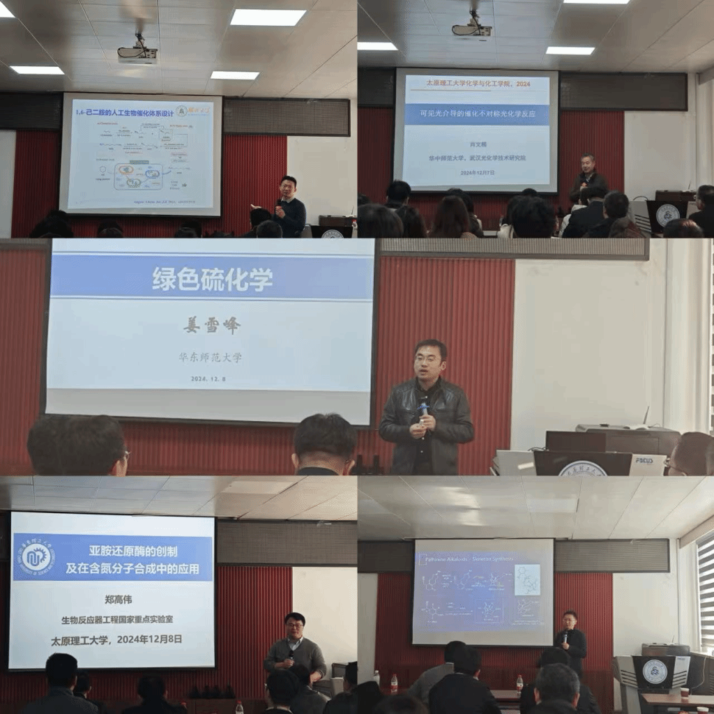 会上,华中师范大学肖文精教授以《可见光介导的催化不对称光化学反应》为题,分享了手性双功能催化、氧化去质子电子转移、能量转移等多种高效环保光化学合成策略;湖北大学李爱涛教授围绕《细胞色素P450酶的创制及其催化应用研究》主题,讲述了大宗化学品己二酸和己二醇等功能化学品生物合成体系的构建;华东师范大学姜雪峰教授作了题为《绿色硫化学》的精彩报告,分享了科学研究、人才培养、平台开发、仪器创制等方面的典型案例;华东理工大学的郑高伟教授围绕亚胺还原酶在手性氮杂环分子、大位阻含氮分子合成中的应用及亚胺还原酶立体选择性演化做了《亚胺还原酶的创制及在含氮分子合成中的应用》的报告;贵州大学的何述钟教授结合课题组开发的新颖骨架成环反应策略,作了题为《黔产特色天然产物的全合成》的报告。在场师生积极向专家进行了请教学习、互动交流。