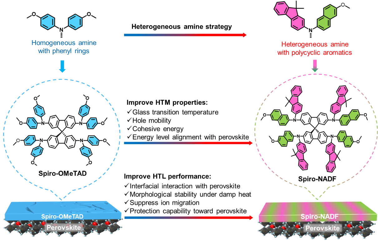 钙钛矿太阳能电池作为一种新型太阳能电池,其低成本、高光电转换效率和可溶液制备等优点,吸引了科研界和产业界的广泛关注。然而,钙钛矿太阳能电池在湿热、光照等条件下差的耐用性制约了其实际应用。在明确商业化空穴传输材料Spiro-OMeTAD低的玻璃化转变温度是造成空穴传输层形貌热应力不稳定,进而导致电池器件耐用性差的主要问题基础上,研究团队提出稠环异质胺修饰螺环外围提升空穴传输材料性能的策略。