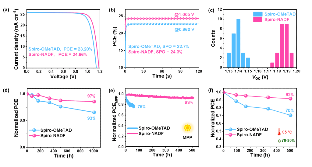 以Spiro-NADF制备的钙钛矿太阳能电池获得了24.66%的光电转换效率和1.190 V的开路电压,在最大功率点连续光照、温度为85 ℃、湿度为70-90%等条件下工作500小时后仍能保持初始效率的92%以上,表现出好的耐用性。这项工作指出了稠环异质胺修饰在提升空穴传输材料自身性能和提高钙钛矿太阳能电池耐用性方面还有很大提升空间。
